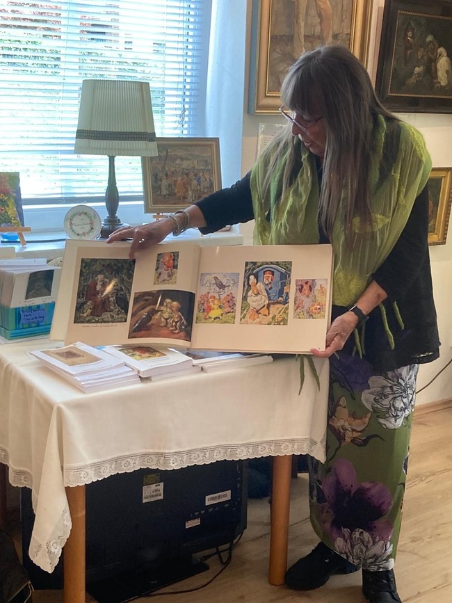 Der andere Teil der Besuchergruppe wurde von Jörg Eimer (dessen Großmutter ebenfalls eine Schwester Ernst Eimers war) im Blauen und Grünen Salon erwartet. Bei Kaffee und Kuchen erläuterte er die Sonderausstellung „Hommage an alte Meister“ von Karl Heinz Horst (1927–2009) und gab Einblicke in die vielfältigen Vereinsaktivitäten.
